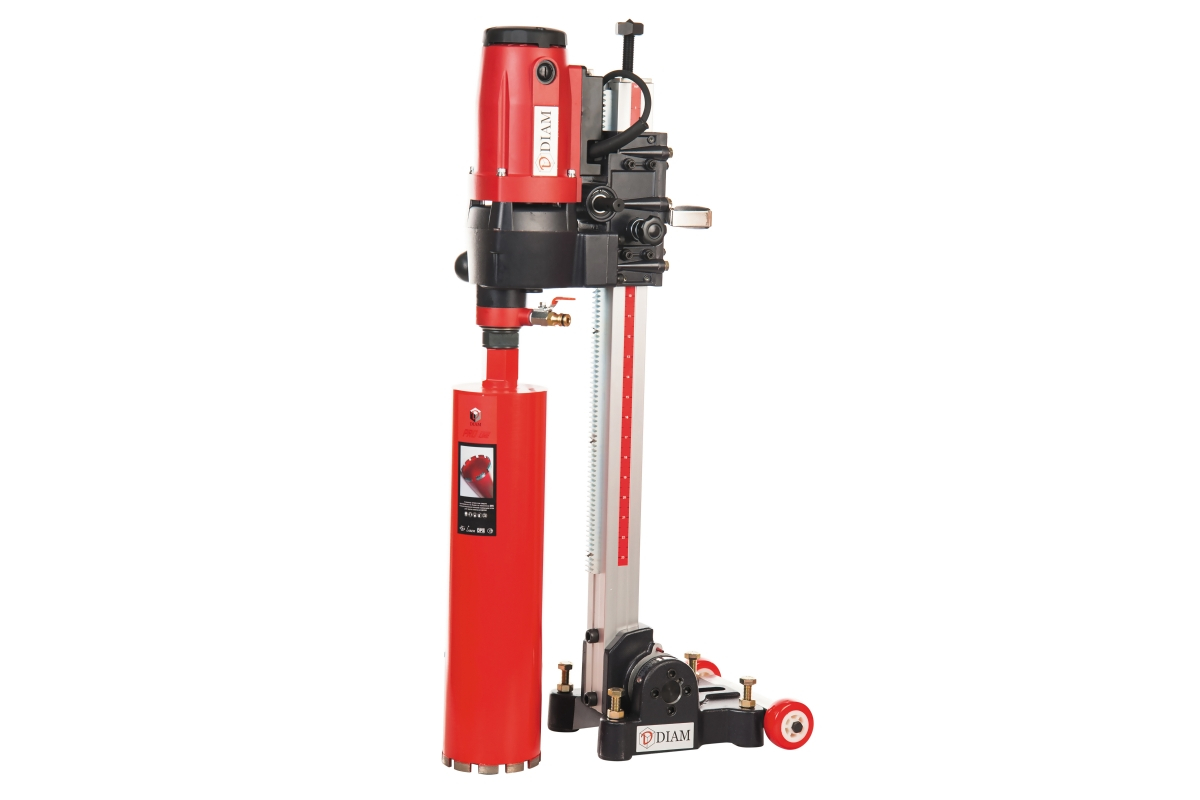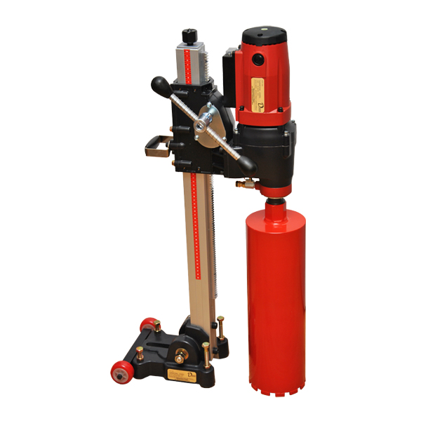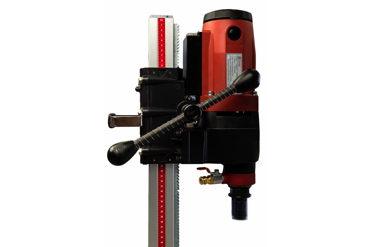 Установка рассчитана на сверление исключительно под прямым углом. Она справляется с твердыми поверхностями вроде кирпича или бетона, создавая отверстия диаметром свыше 10 мм. Тип стойки – Normal, посадка коронки – внешняя, тип сверления – мокрое.