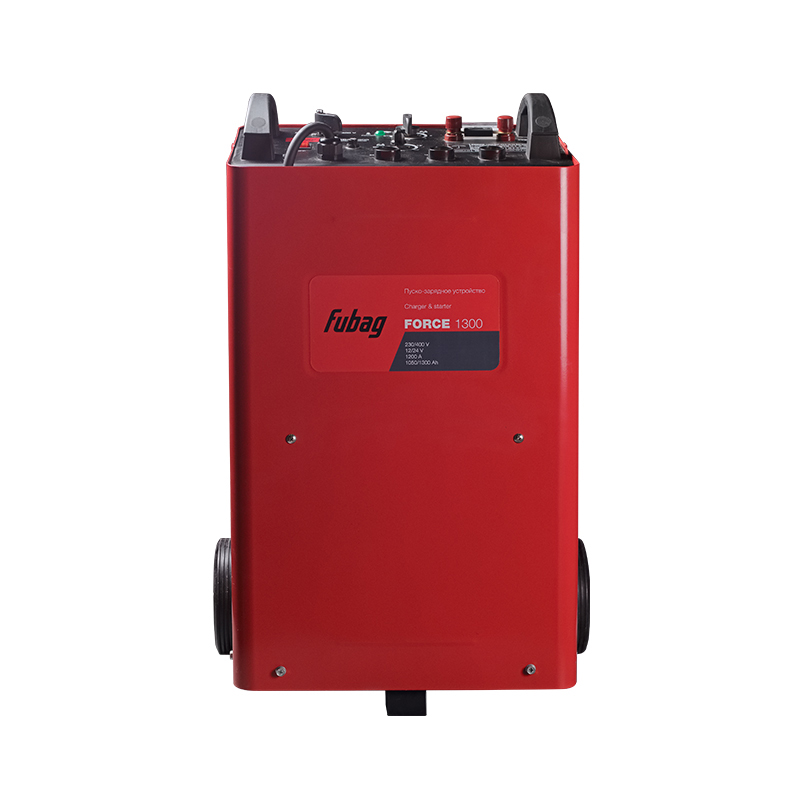 FUBAG FORCE 1300 — мощное пуско-зарядное устройство, работающее на напряжении 380 / 220 В при максимальном токе пуска 1200 А и токе зарядки 45-130 А. Устройство предназначено для использования в течение всего года в крупных автохозяйствах для быстрой зарядки кислотных аккумуляторов и запуска всех типов легковых автомобилей, фургонов, грузовиков или тракторов.