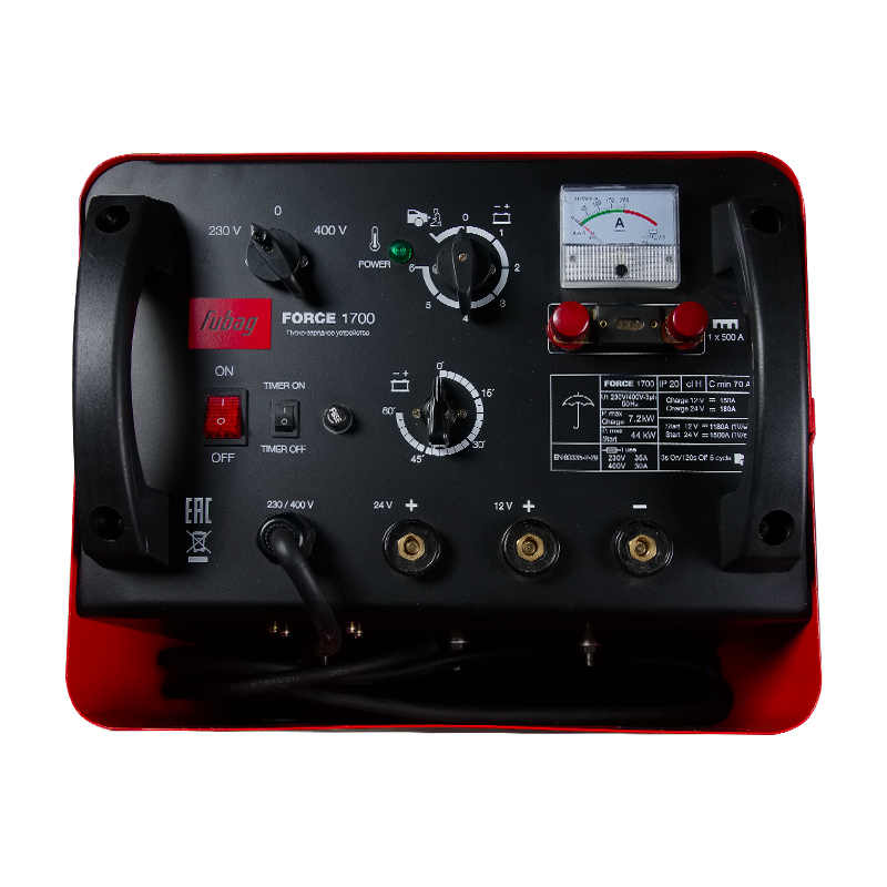 FUBAG FORCE 1700 — мощное пуско-зарядное устройство, которое работает на напряжении 380 / 220 В при максимальном токе пуска 1500 А и токе зарядки 50-280 А. Устройство предназначено для использования в течение всего года в крупных автохозяйствах для быстрой зарядки кислотных аккумуляторов и запуска всех типов легковых автомобилей, фургонов, грузовиков или тракторов.