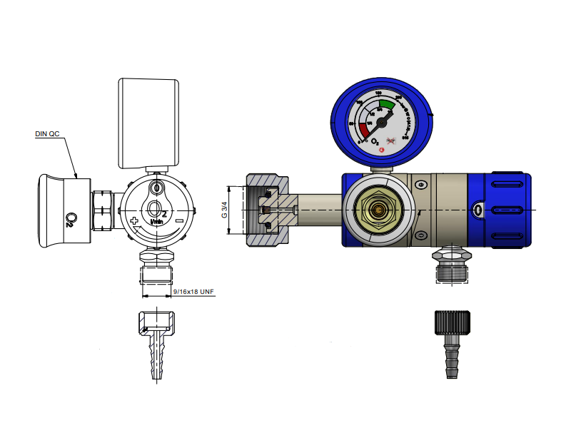 Отличительная черта арт. 0720120N – удлиненный штуцер для беспрепятственного подключения на баллоны большого объема (20+ литров), боковое расположение DIN-коннектора.