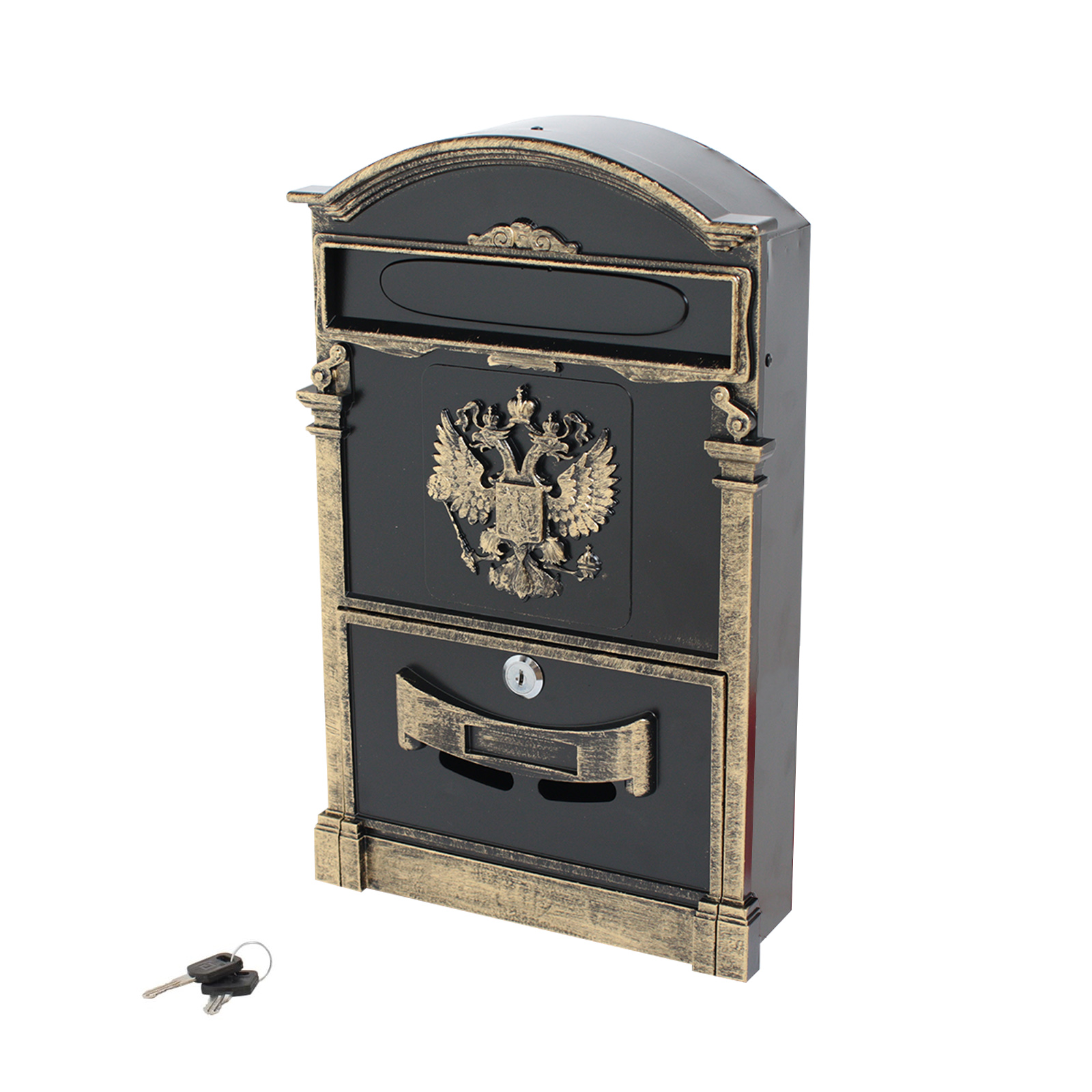 Ящик почтовый индивидуальный. Материал — сталь, алюминий. Цвет — старая бронза. Размеры — 405*255*75мм. Замок с 2 ключами.