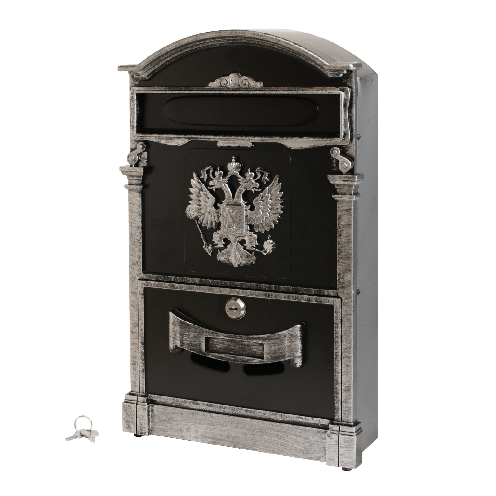 Ящик почтовый индивидуальный. Материал — сталь, алюминий. Цвет — старое серебро. Размеры — 405*255*75мм. Замок с 2 ключами.
