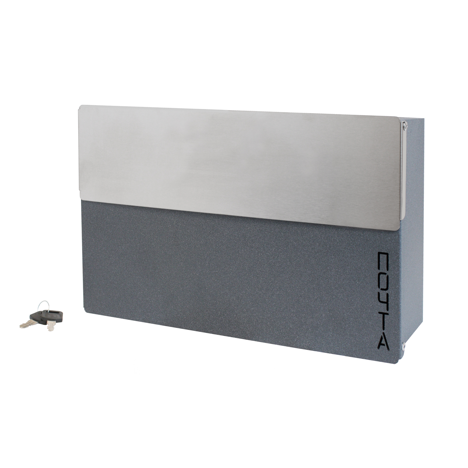 Ящик почтовый индивидуальный. Материал — сталь, нержавеющая сталь. Цвет — серый металлик. Размеры — 365*235*92мм. Замок с 2 ключами.