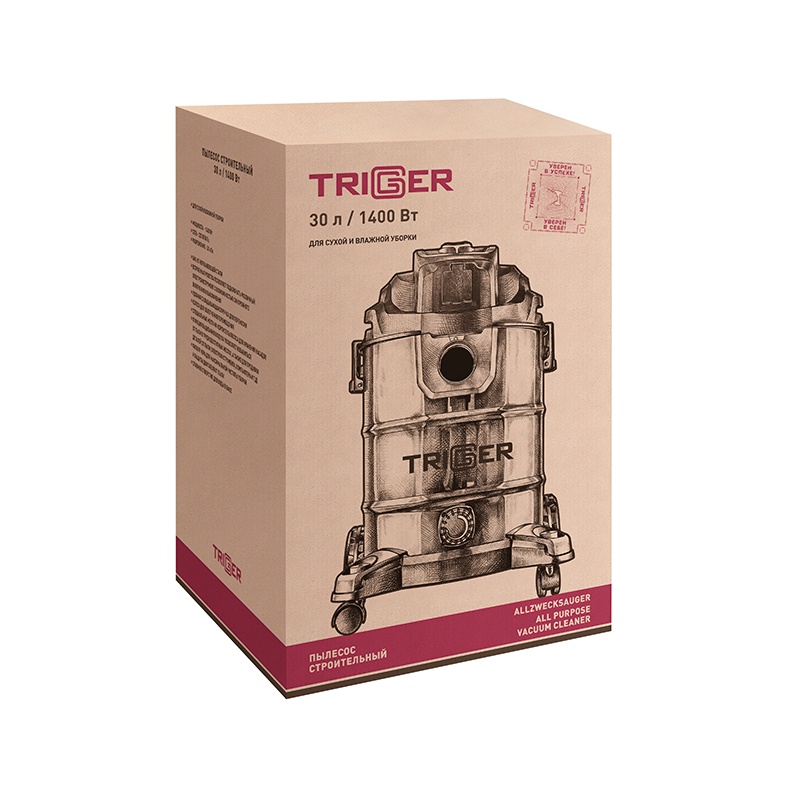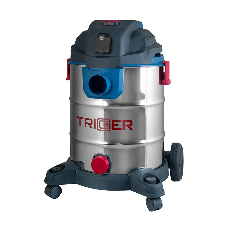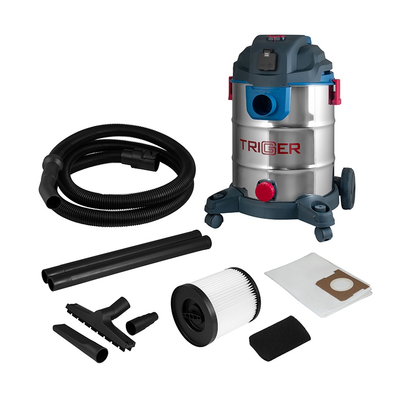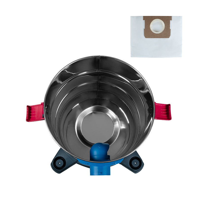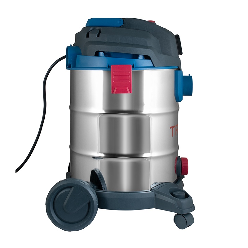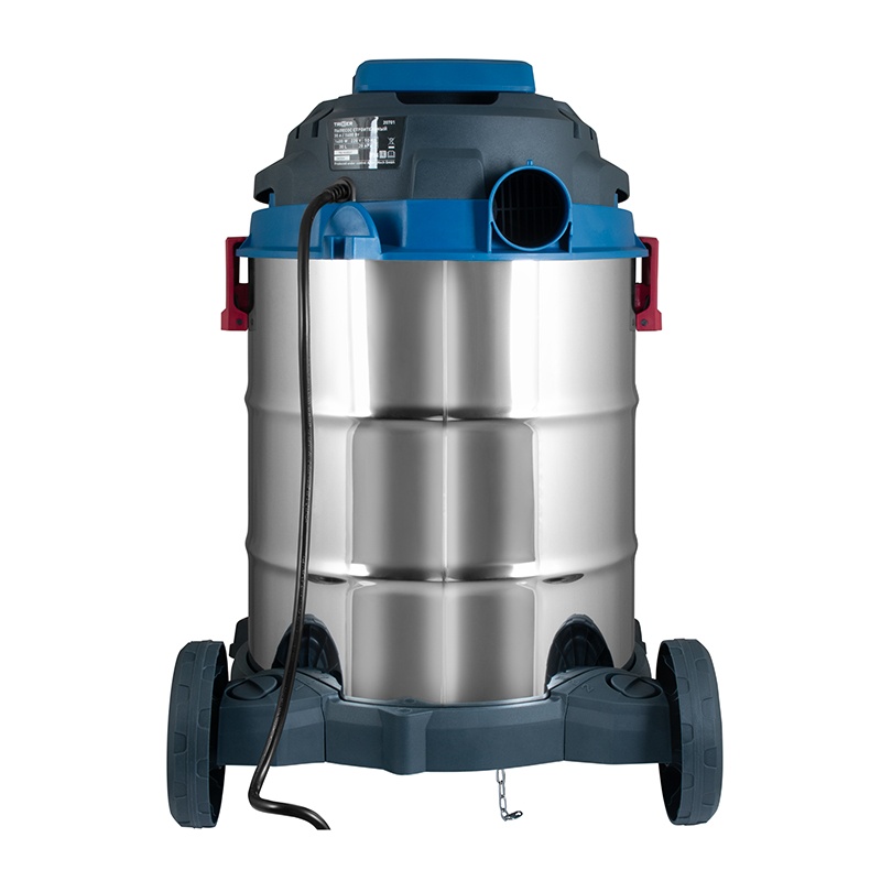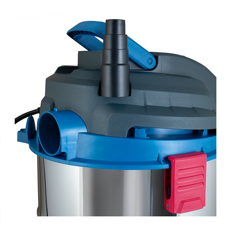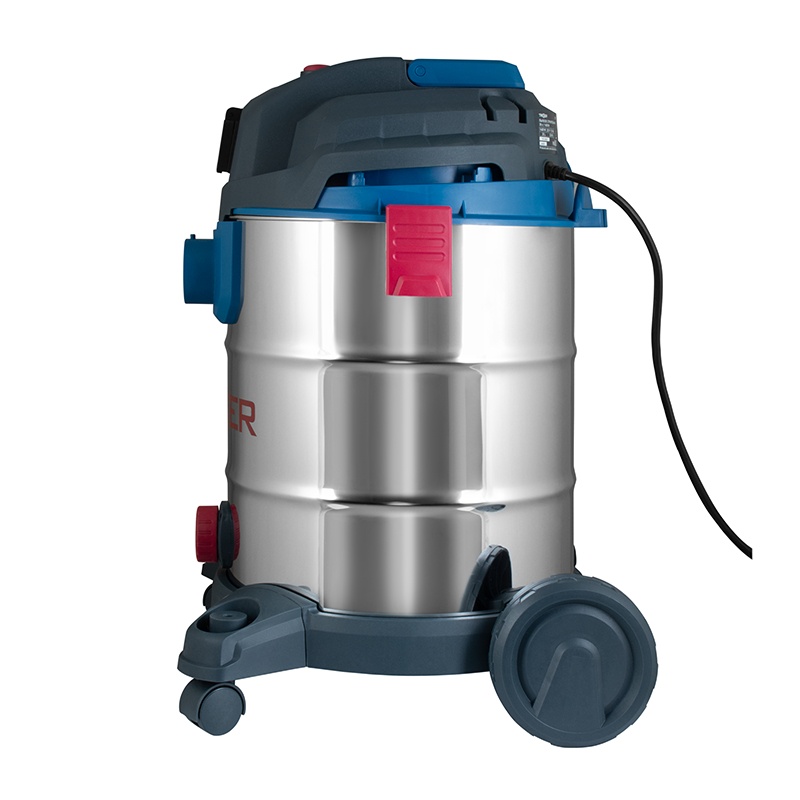 Бак из нержавеющей стали емкостью 30 л. Удобная ручка для переноски. Колеса для облегчения перемещения. Специальные места на корпусе пылесоса для хранения насадок. У пылесоса имеется функция выдувания для быстрой очистки всасывающего шланга или удаления мусора из труднодоступных мест. Фильтр НЕРА для максимальной чистоты уборки и защиты двигателя от пыли. Сливное отверстие для воды с пробкой в баке.