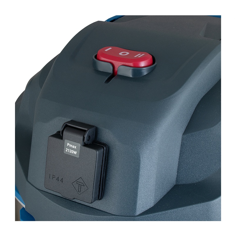 Подходит для сухой и влажной уборки. Встроенная розетка позволяет подключать различный электроинструмент с возможностью синхронного включения и выключения мощностью до 2 кВт.
