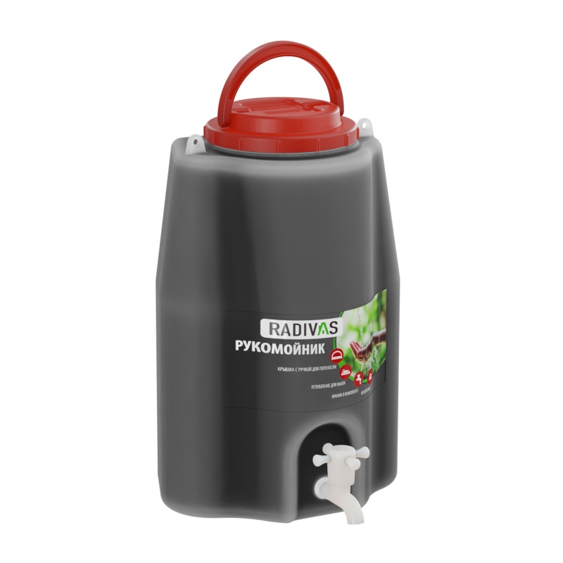Применяется для мытья рук в условиях отсутствия централизованного водоснабжения. Верхняя крышка оборудована ручкой для удобной транспортировки, переноса изделия, а также выемкой под мыло. На корпусе рукомойника — ушки с отверствиями для креплений рукомойника. Стенки и дно отлично выдерживают давление воды и не деформируются при использовании. Рукомойник оборудован герметичным краником.