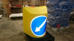 Буфер дорожный разделительный 920x1200x1250 (Дорожная тумба) предназначен для разграничения потоков движения. Буфер устанавливается в местах повышенной опасности на дорогах: в начале разделительного ограждения, на островках безопасности, рядом с различными препятствиями. Благодаря яркой окраске и световозвращающей маске дорожного знака, изделие очень хорошо заметно на дороге и позволяет снизить аварийность. Для устойчивости изделие может заполняться водой или песком. Для этого в задней части изделия предусмотрено увеличенное загрузочное отверстие. Возможна комплектация маской дорожного знака из световозвращающей пленки типа А, Б или В по выбору Заказчика.