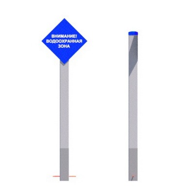 Знак обозначения водоохранной зоны в соответствии с приказом Минприроды №59 от 7 февраля 2020 г. Опора знака изготовлена из цельнолитой бесшовной трубы квадратного сечения размером 200х200мм. Информационная табличка знака изготовлена из пластика, либо металла по согласованию с Заказчиком. В нижней части имеется анкерная трубка для предотвращения извлечения знака.