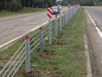 Дорожное силовое тросовое ограждение ГОСТ 52607 с удерживающей способностью У4. Применяется при эксплуатации дорог общего пользования для обеспечения безопасности дорожного движения