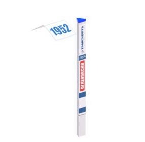 Опознавательный километровый знак ПЛ-КМ-ТР (направление отдела эксплуатации нефтепроводов и нефтебаз ПАО «Транснефть»). в соответствии с ОТТ-75.200.00-КТН-0412-22 — ООО «НИИ Транснефть». Специализированный столбик треугольного сечения 180мм для обозначения магистральных нефтепроводов по стандартам Транснефть.На боковых гранях столбика по техническому заданию наносится информационная надпись. В нижней части имеется антивандальное анкерное устройство. В верхней части имеется козырек для вертолетного патрулирования.