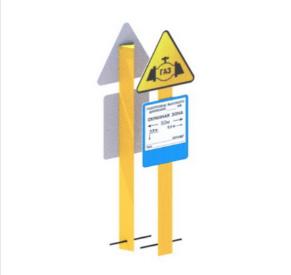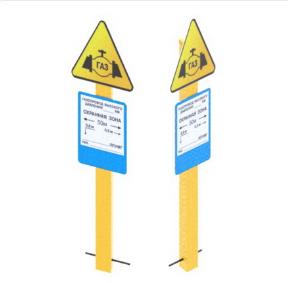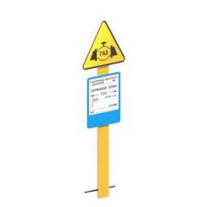 Опознавательный знак Осторожно Газопровод Согласно СТО ГАЗПРОМ 2-3.5-454-2010 «Правила эксплуатации магистральных газопроводов». Корпус столба знака представляет собой трехгранную опору и изготовлен их специализированного композитного материала толщиной 4мм. Сверху корпус столба знака закрыт крышкой желтого цвета. В нижней части столба имеется антивандальное анкерное устройство. На одной из граней смонтирована информационная табличка Осторожно газопровод 710х710х710мм, а также знак закрепления газопровода размером 560х710мм.
