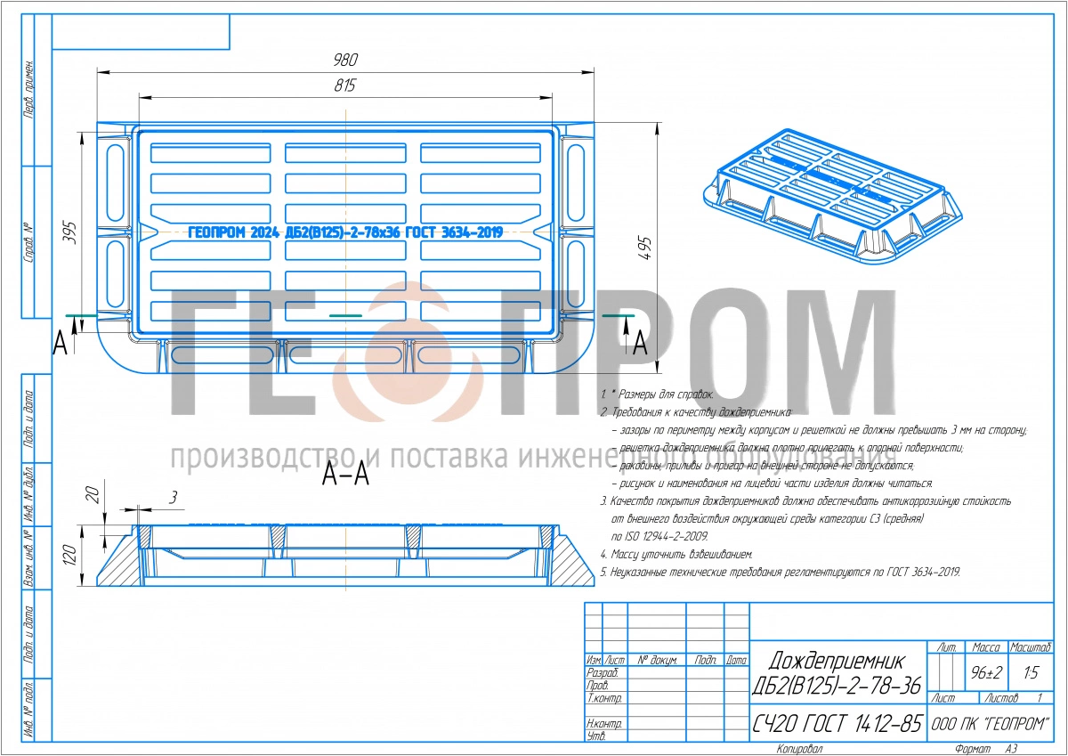 Чугунный дождеприёмник ДБ2 (В125)-78х36 (h=120мм) используется для обустройства ливневой системы. Составляющие такого элемента — это основной корпус и решётка. Корпус надёжно крепится к дорожному полотну, а решётка вкладывается в основание. Мы предлагаем купить дождеприемник дб, который поможет обустроить дороги и тротуары, отводя дождевую воду в канализационную систему.