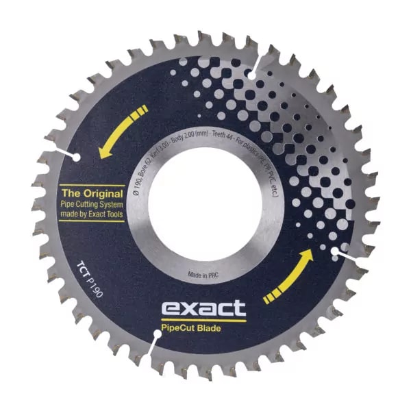 Диаметр 190мм, посадка 62мм, 44 зуба. Диск карбидо-вольфрамового типа. Подходит для резки пластиковых труб труборезом Р1000.