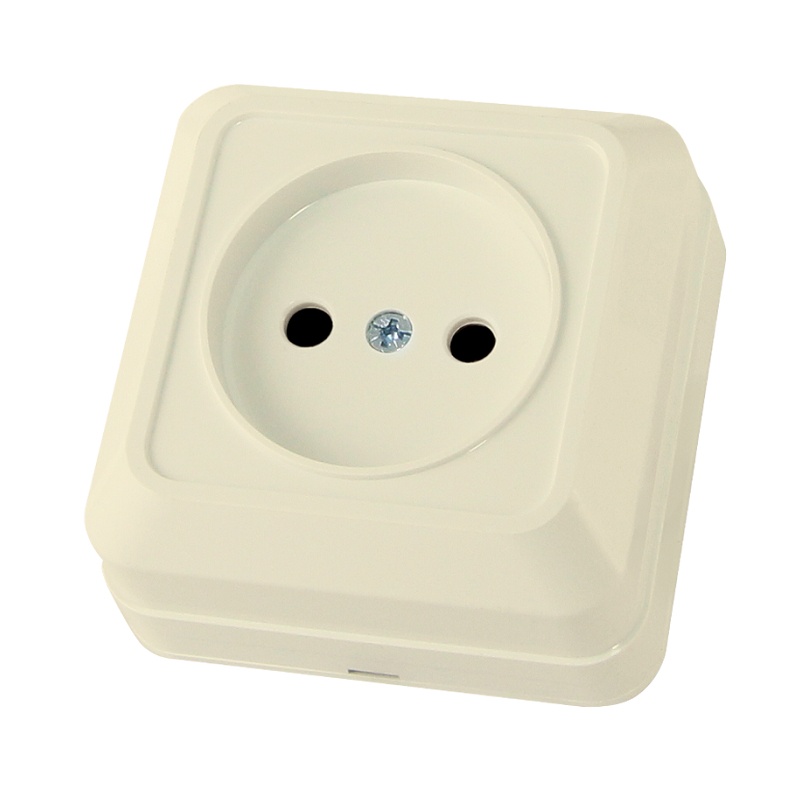 Розетка одноместная без заземляющего контакта открытой установки, цвет слоновая кость. Корпус из самозатухающего ABS-пластика, обеспечивающего прочность и устойчивость к воздействию солнечных лучей. Контакты розетки выполнены из высокоупругой фосфористой бронзы, обеспечивающей надежный контакт и пожаробезопасность на протяжении всего срока службы изделий.