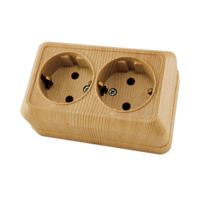 Розетка двухместная с заземляющим контактом открытой установки, цвет светлое дерево (сосна). Корпус из самозатухающего ABS-пластика, обеспечивающего прочность и устойчивость к воздействию солнечных лучей. Контакты розеток выполнены из высокоупругой фосфористой бронзы, обеспечивающей надежный контакт и пожаробезопасность на протяжении всего срока службы изделий.