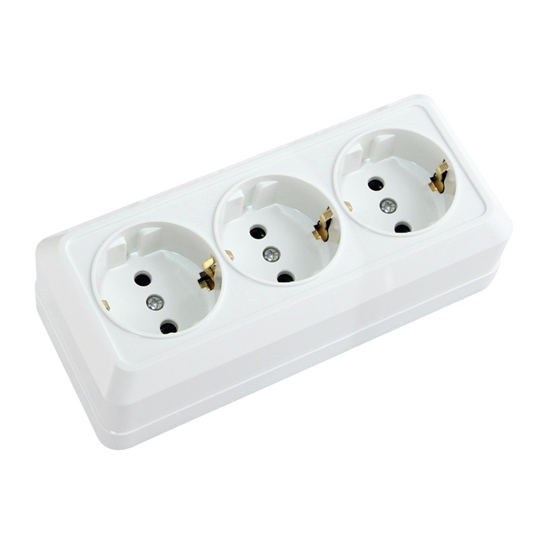 Розетка трехместная с заземляющим контактом открытой установки, цвет белый. Корпус из самозатухающего ABS-пластика, обеспечивающего прочность и устойчивость к воздействию солнечных лучей. Контакты розеток выполнены из высокоупругой фосфористой бронзы, обеспечивающей надежный контакт и пожаробезопасность на протяжении всего срока службы изделий.
