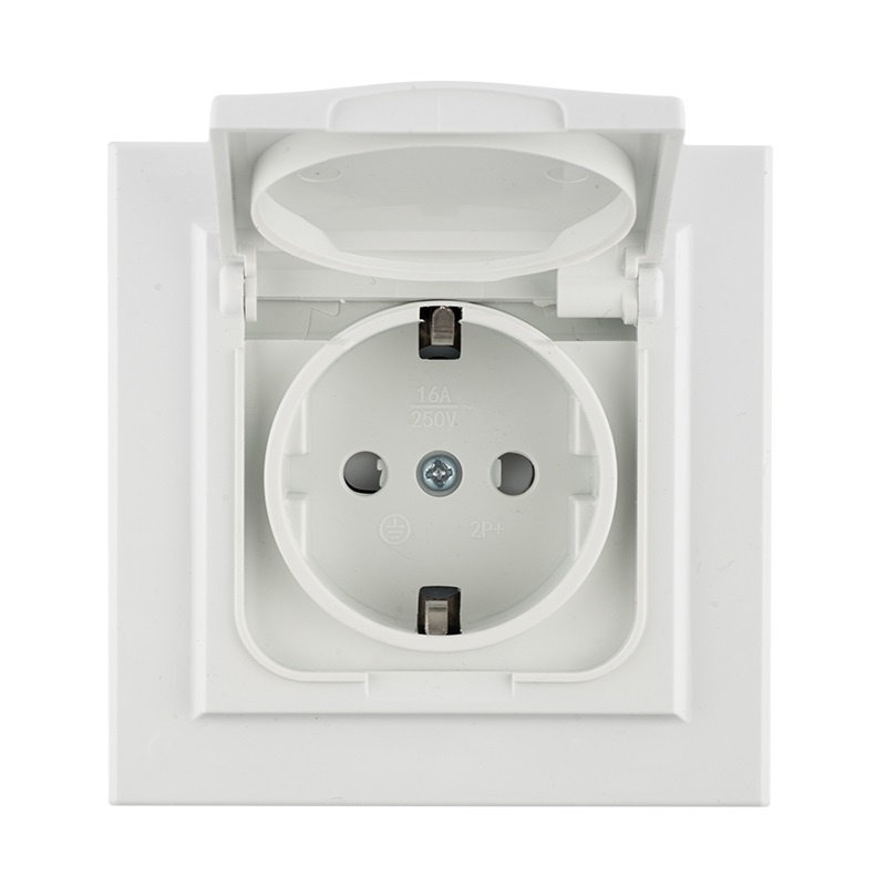 Предназначена для скрытой установки. Розетка с заземлением и крышкой. Корпус выполнен из ABS-пластика, обеспечивающего прочность и термостойкость изделий, устойчивость к воздействию солнечных лучей. Основание розетки выполнено из негорючего пластика. Защитные шторки защищают отверстия от посторонних предметов. Наличие крышки гарантирует защиту от пыли и воды.