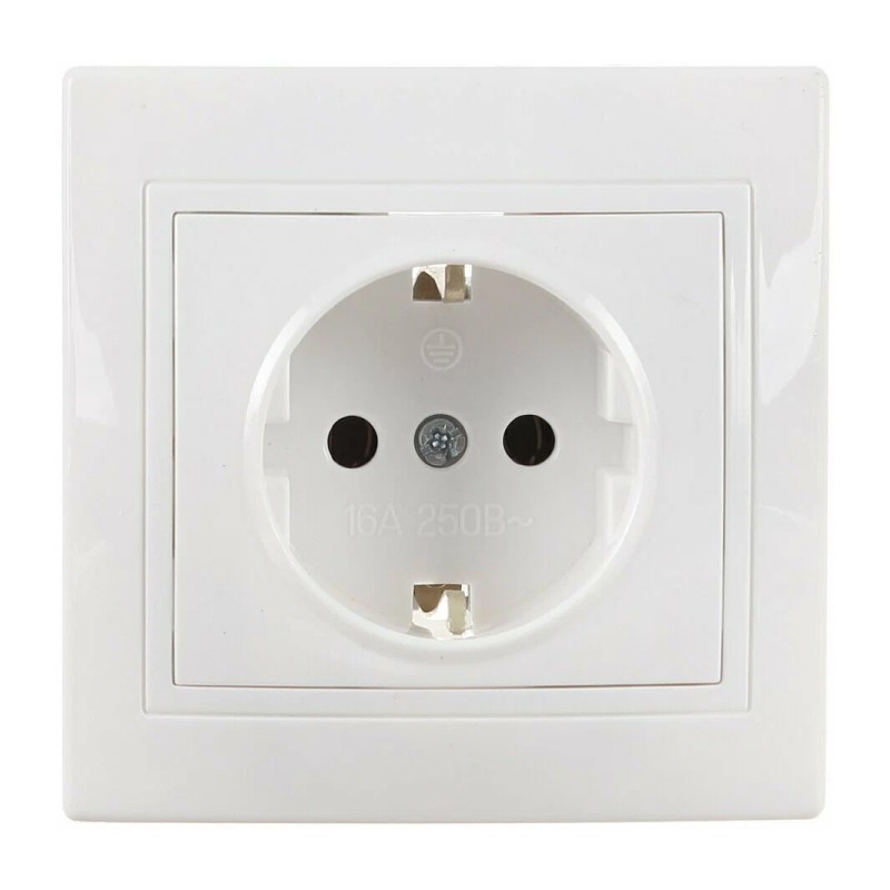 Розетка с заземлением скрытой установки, цвет белый. Основание керамическое, корпус выполнен из самозатухающего ABS-пластика, обеспечивающего прочность и устойчивость к воздействию солнечных лучей. Контакты розеток из высокоупругой фосфористой бронзы, обеспечивают надежный электрический контакт. Поставляется в комплекте с рамкой