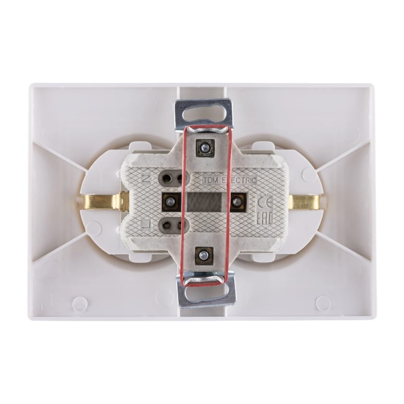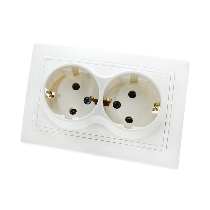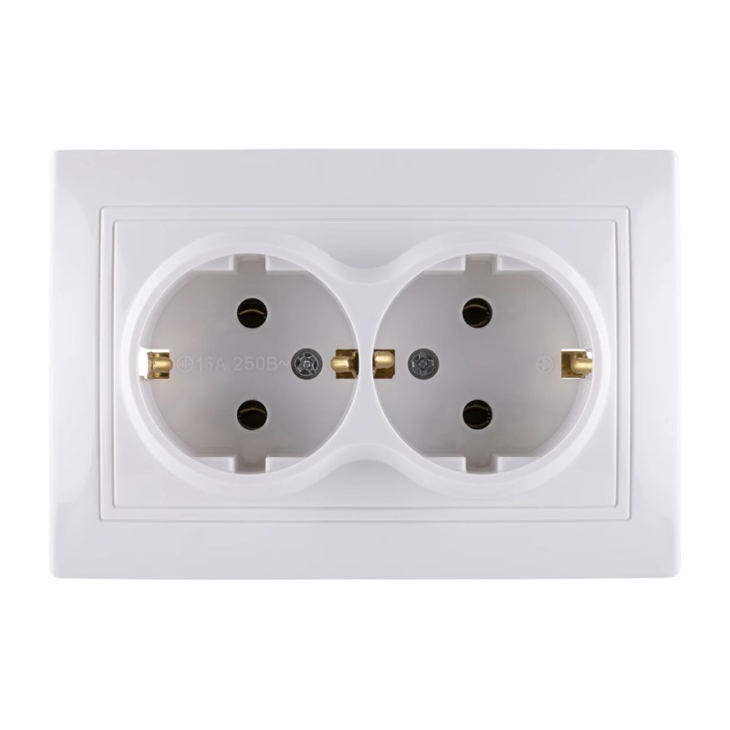 Розетка двойная с заземлением скрытой установки, цвет белый. Основание керамическое, корпус выполнен из самозатухающего ABS-пластика, обеспечивающего прочность и устойчивость к воздействию солнечных лучей. Контакты розеток из высокоупругой фосфористой бронзы, обеспечивают надежный электрический контакт. Поставляется в комплекте с рамкой