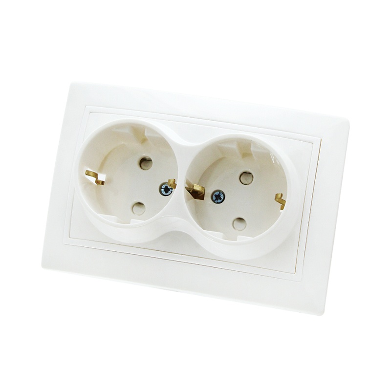 Розетка двойная с заземлением и шторками, скрытой установки, цвет белый. Основание керамическое, корпус выполнен из самозатухающего ABS-пластика, обеспечивающего прочность и устойчивость к воздействию солнечных лучей. Контакты розеток из высокоупругой фосфористой бронзы, обеспечивают надежный электрический контакт. Поставляется в комплекте с рамкой