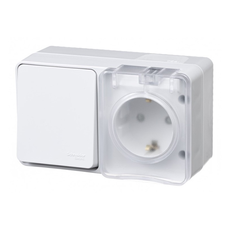 Предназначен для открытой установки. Серия AtlasDesign Profi54 создана специально для тех мест, где требуется повышенная защита от влаги и пыли. Блок состоит из одноклавишного выключателя и розетки с заземлением, шторками и крышкой, для открытой установки.