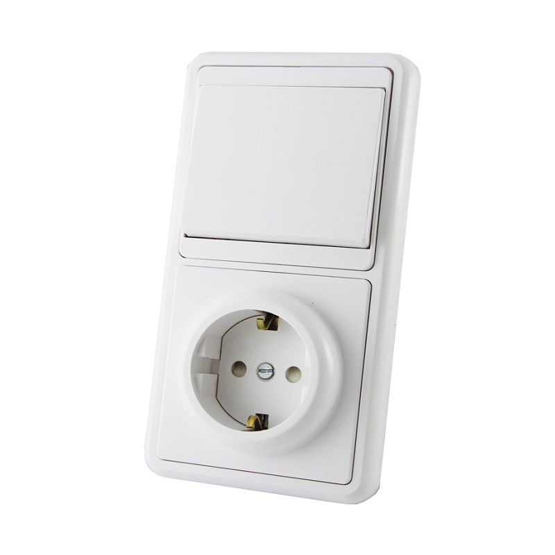 Блок комбинированный: выключатель одноклавишный + роезтка с заземлением и шторками, скрытой установки, цвет белый. Корпус цельный с рамкой, выполнен из самозатухающего ABS-пластика, обеспечивающего прочность и устойчивость к воздействию солнечных лучей. Контакты розеток из высокоупругой фосфористой бронзы, обеспечивают надежный электрический контакт.