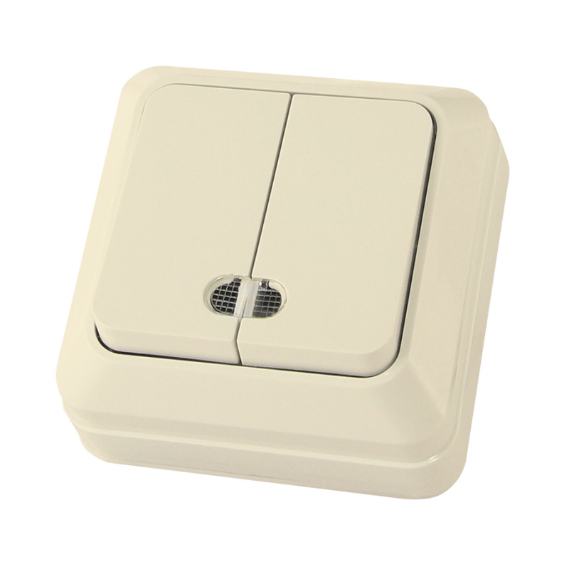 Выключатель двухклавишный с индикацией открытой установки, цвет слоновая кость. Корпус из самозатухающего ABS-пластика, обеспечивающего прочность и устойчивость к воздействию солнечных лучей. Металлокерамические контакты позволяют сочетать высокую дугостойкость с хорошей проводимостью.