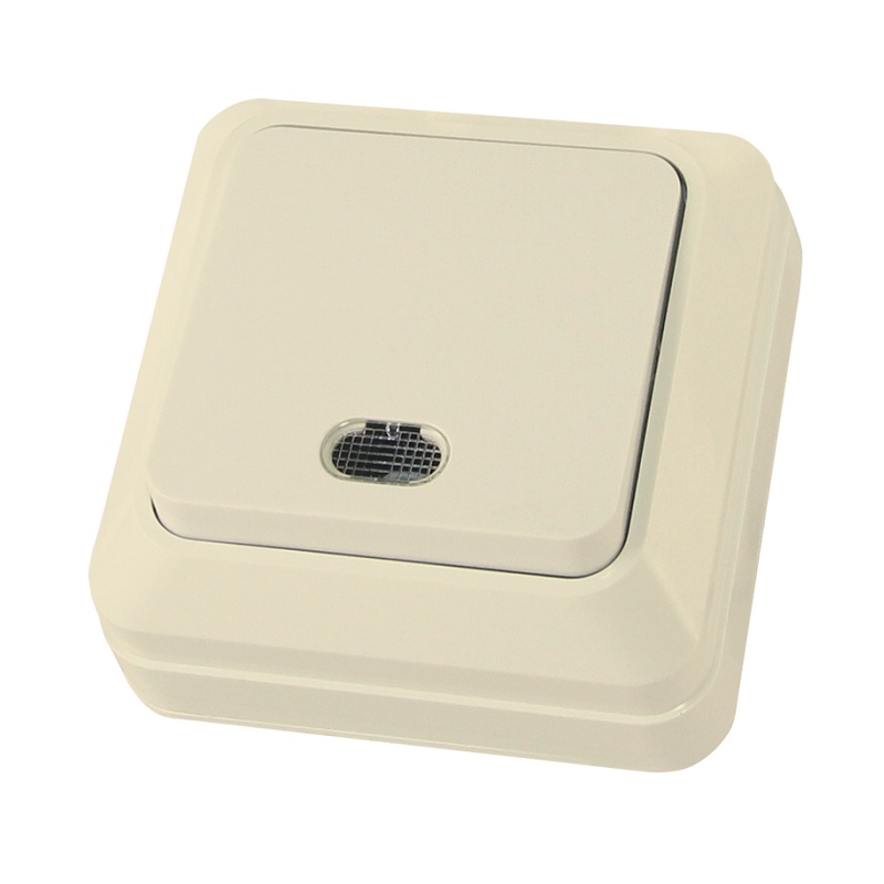 Выключатель одноклавишный с индикацией открытой установки, цвет слоновая кость. Корпус из самозатухающего ABS-пластика, обеспечивающего прочность и устойчивость к воздействию солнечных лучей. Металлокерамические контакты позволяют сочетать высокую дугостойкость с хорошей проводимостью.