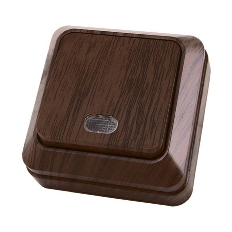Выключатель одноклавишный с индикацией открытой установки, цвет темное дерево (бук/венге). Корпус из самозатухающего ABS-пластика, обеспечивающего прочность и устойчивость к воздействию солнечных лучей. Металлокерамические контакты позволяют сочетать высокую дугостойкость с хорошей проводимостью.