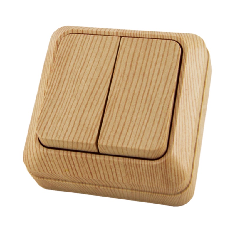Выключатель двухклавишный открытой установки, цвет светлое дерево (сосна). Корпус из самозатухающего ABS-пластика, обеспечивающего прочность и устойчивость к воздействию солнечных лучей. Металлокерамические контакты позволяют сочетать высокую дугостойкость с хорошей проводимостью.