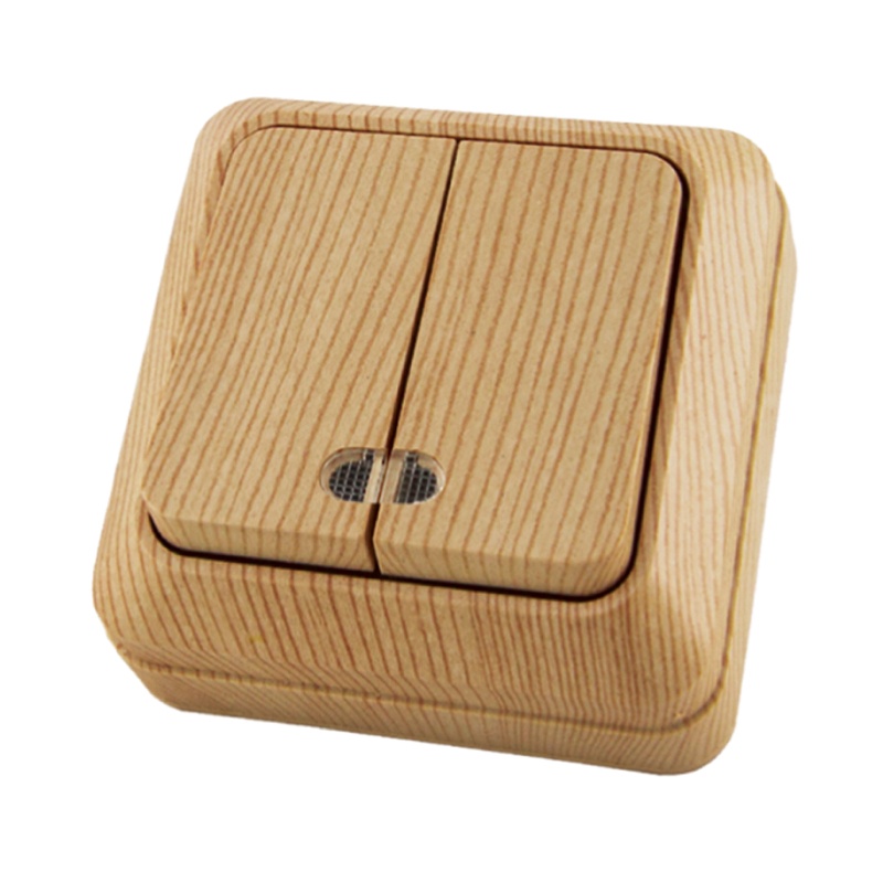 Выключатель двухклавишный с индикацией открытой установки, цвет светлое дерево (сосна). Корпус из самозатухающего ABS-пластика, обеспечивающего прочность и устойчивость к воздействию солнечных лучей. Металлокерамические контакты позволяют сочетать высокую дугостойкость с хорошей проводимостью.