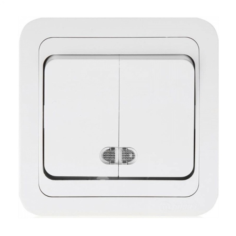 Предназначен для включения и выключения света. Двухклавишный выключатель для скрытой проводки. Имеет встроенный индикатор подсветки клавиш. Поставляется с рамкой в комплекте.