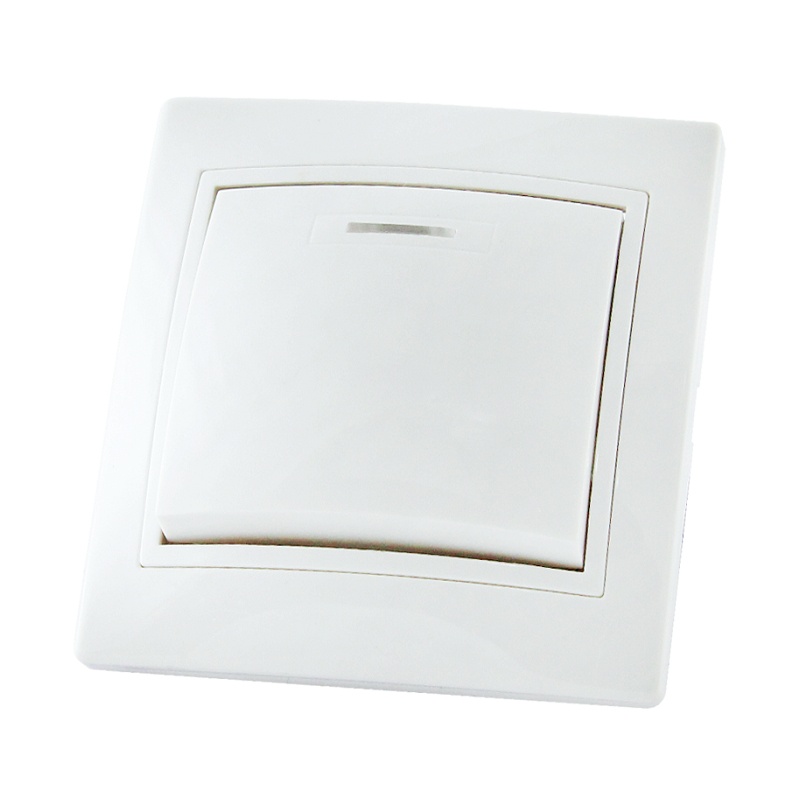 Выключатель одноклавишный с индикацией скрытой установки, цвет белый. Основание керамическое, корпус выполнен из самозатухающего ABS-пластика, обеспечивающего прочность и устойчивость к воздействию солнечных лучей. Металлокерамические (AgNi) контакты позволяют сочетать высокую дугостойкость с хорошей проводимостью. Поставляется в комплекте с рамкой