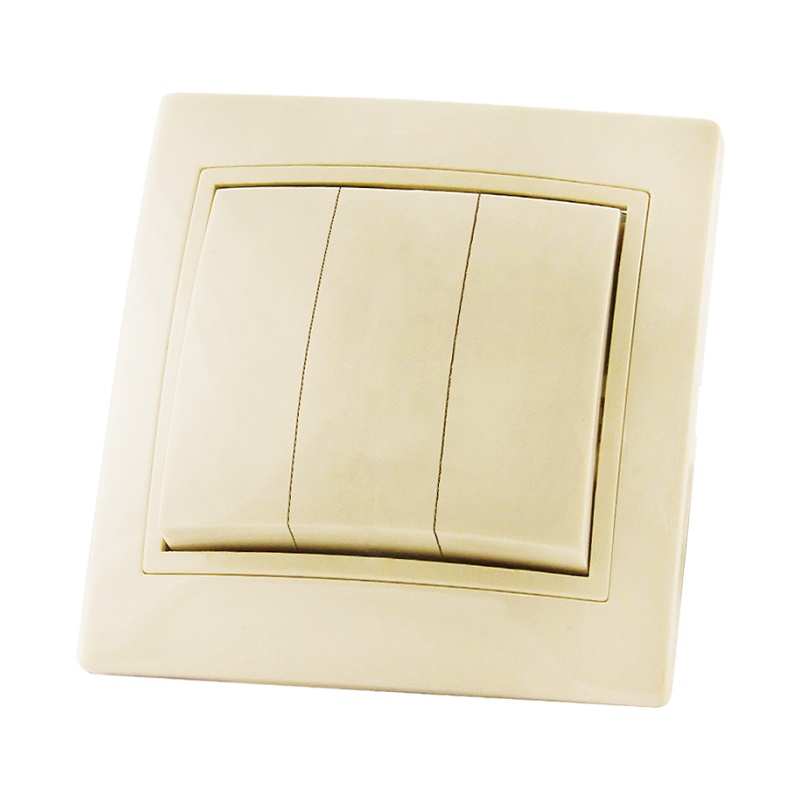 Выключатель трехклавишный скрытой установки, цвет слоновая кость. Основание керамическое, корпус выполнен из самозатухающего ABS-пластика, обеспечивающего прочность и устойчивость к воздействию солнечных лучей. Металлокерамические (AgNi) контакты позволяют сочетать высокую дугостойкость с хорошей проводимостью. Поставляется в комплекте с рамкой