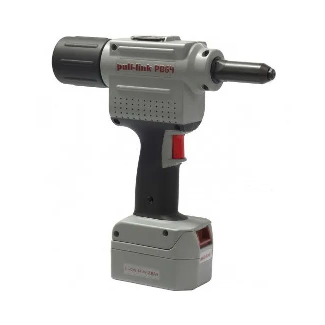 Аккумуляторный профессиональный заклёпочник Рull-link PB64 служит для работы с вытяжными заклёпками стандартными и структурными, Ø 4 — 6,4 mm из алюминия, стали, нержавейки. Имеет силу вытягивания 18000 H. Рабочий шаг 27 мм. Обладает стильным внешним видом, удобная ручка, изготовлена из высокопрочного пластика. Располагает сравнительно небольшой массой 2,2 кг (включая батарею), что делает его весьма удобным в применении. Еще одной полезной опцией в данном устройстве является индикатор заряда батареи, стоит лишь нажать на кнопку и он укажет степень заряда аккумулятора.