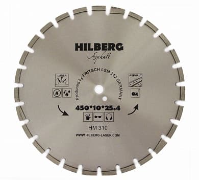 Алмазный диск Hilberg Asphalt Laser Ø450 мм с лазерной наваркой сегментов используется для резки асфальта, свежего бетона и песчаника. Толщина алмазного слоя 3,6 мм, а высота 10 мм. Посадочное отверстие — 25,4 мм. Резка осуществляется как с применением водяного охлаждения. так и без. Наличие защитных зубьев обеспечивает увеличенный ресурс и скорость реза. Диск подходит для работы на нарезчиках швов.