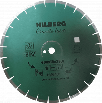Алмазный диск Hilberg Granite Laser Ø400 мм с лазерной наваркой сегментов изготовлен специально для резки гранита. Диск произведен на немецком оборудовании Dr. Fritsch. Высота алмазного слоя 10 мм. Посадочное отверстие — 25,4 мм. Резка осуществляется как с применением водяного охлаждения, так и без. Диск подходит для работы на плиткорезных станках.