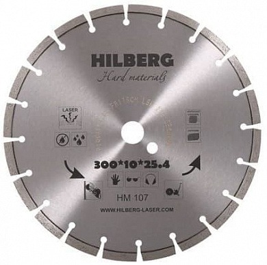 Алмазный диск Hilberg Materials Laser Ø300 мм изготовлен методом лазерной наварки сегментов на немецком оборудовании Dr. Fritsch. Диск используется для резки армированного бетона, гранита, огнеупоров и железобетона. Толщина алмазного слоя 3 мм, а высота 10 мм. Посадочное отверстие — 25,4 мм. Резка осуществляется как с применением водяного охлаждения, так и без. Диск подходит для работы на нарезчиках швов.