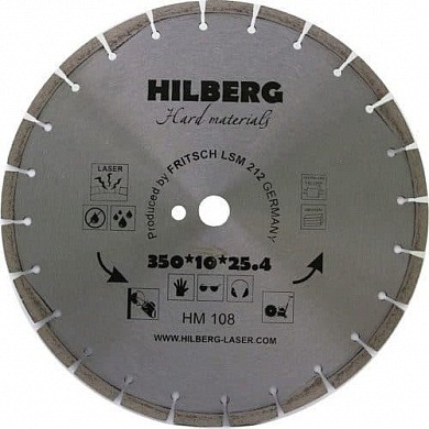 Алмазный диск Hilberg Materials Laser Ø350 мм изготовлен методом лазерной наварки сегментов на немецком оборудовании Dr. Fritsch. Диск используется для резки армированного бетона, гранита, огнеупоров и железобетона. Толщина алмазного слоя 3,2 мм, а высота 10 мм. Посадочное отверстие — 25,4 мм. Резка осуществляется как с применением водяного охлаждения, так и без. Диск подходит для работы на нарезчиках швов.
