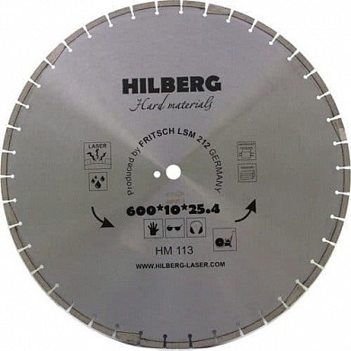 Алмазный диск Hilberg Materials Laser Ø600 мм изготовлен методом лазерной наварки сегментов на немецком оборудовании Dr. Fritsch. Диск используется для резки армированного бетона, гранита, огнеупоров и железобетона. Толщина алмазного слоя 4,3 мм, а высота 10 мм. Посадочное отверстие — 25,4 мм. Резка осуществляется как с применением водяного охлаждения, так и без. Диск подходит для работы на нарезчиках швов.