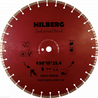 Алмазный диск Hilberg Industrial Hard Ø450 мм с лазерной наваркой сегментов произведен на немецком оборудовании Dr. Fritsch. Диск используется для резки железобетона, сильноармированного бетона и твердого бетона. Толщина алмазного слоя 3,6 мм, а высота 10 мм. Посадочное отверстие — 25,4 мм. Диск обладает повышенной скоростью реза. Подходит для работы на камнерезных станках, бензорезах, электрорезах и нарезчиках швов.