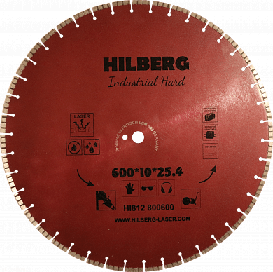 Алмазный диск Hilberg Industrial Hard Ø600 мм с лазерной наваркой сегментов произведен на немецком оборудовании Dr. Fritsch. Диск используется для резки железобетона, сильноармированного бетона и твердого бетона. Толщина алмазного слоя 3,6 мм, а высота 10 мм. Посадочное отверстие — 25,4 мм. Диск обладает повышенной скоростью реза. Подходит для работы на камнерезных станках, бензорезах, электрорезах и нарезчиках швов.