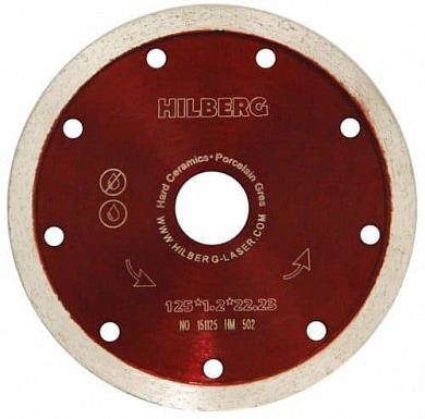 Алмазный диск Hilberg Сплошной Ультратонкий Ø125 мм изготовлен методом горячего прессования. Используется для резки керамогранита и твердой керамики. Толщина алмазного слоя 1,2 мм, а высота 8 мм. Посадочное отверстие — 22,23 мм. Сплошная режущая кромка и компенсационные отверстиями на кромке диска обеспечивают дополнительное охлаждение. Резка осуществляется как с применением водяного охлаждения, так и без. Диск подходит для работы на УШМ.