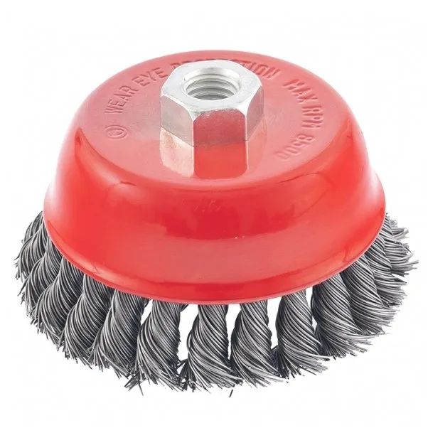 Щетка на УШМ чашка, витая проволока 75 мм, М 14, 0,5 мм — насадка для угловой шлифовальной машины (болгарки), которая значительно увеличивает спектр ее применения. Предназначена для шлифовальных и обдирочных работ. Имеет круглую форму, напоминающую чашку с диаметром окружности 75 мм. Такая форма обеспечивает хорошую площадь прилегания к поверхности, а размер — быструю обработку больших плоскостей.
