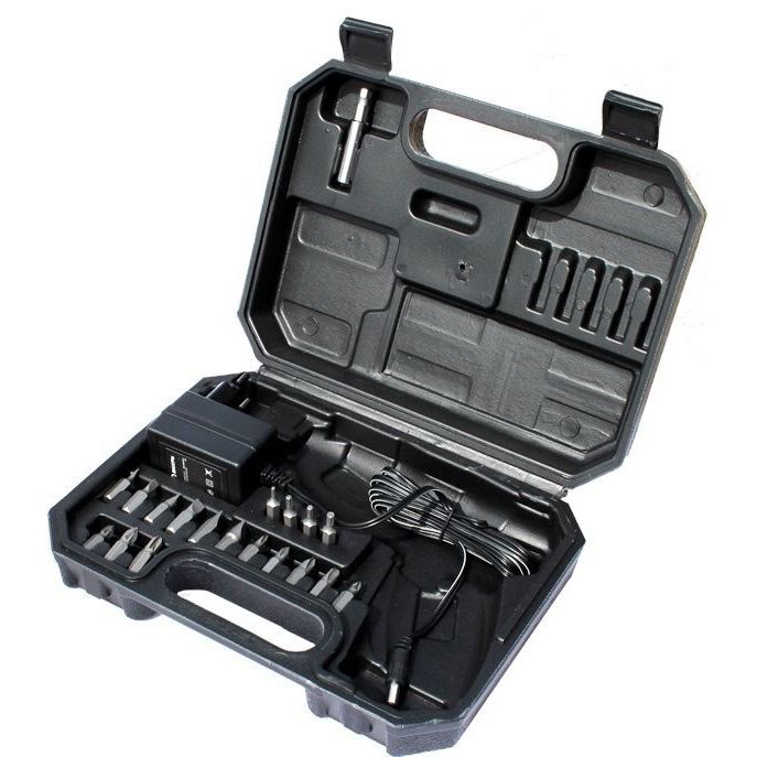 Аккумуляторная отвертка ВИХРЬ ОА-3,6-К – бытовой ручной электроинструмент для закручивания и откручивания шурупов, саморезов, винтов, дюбелей и других видов крепежных изделий. Питание от встроенной литий-ионной аккумуляторной батареи. Кнопка переключателя служит для изменения направления вращения шпинделя (реверс). Среднее положение переключателя реверса блокирует выключатель отвертки.Комплектация:Отвертка со встроенным аккумулятором 1шт.Бита 18 шт.Адаптер-удлинитель для бит 1 шт.Сетевой адаптер 1 шт. Паспорт 1 шт. Упаковка (кейс) 1 шт.