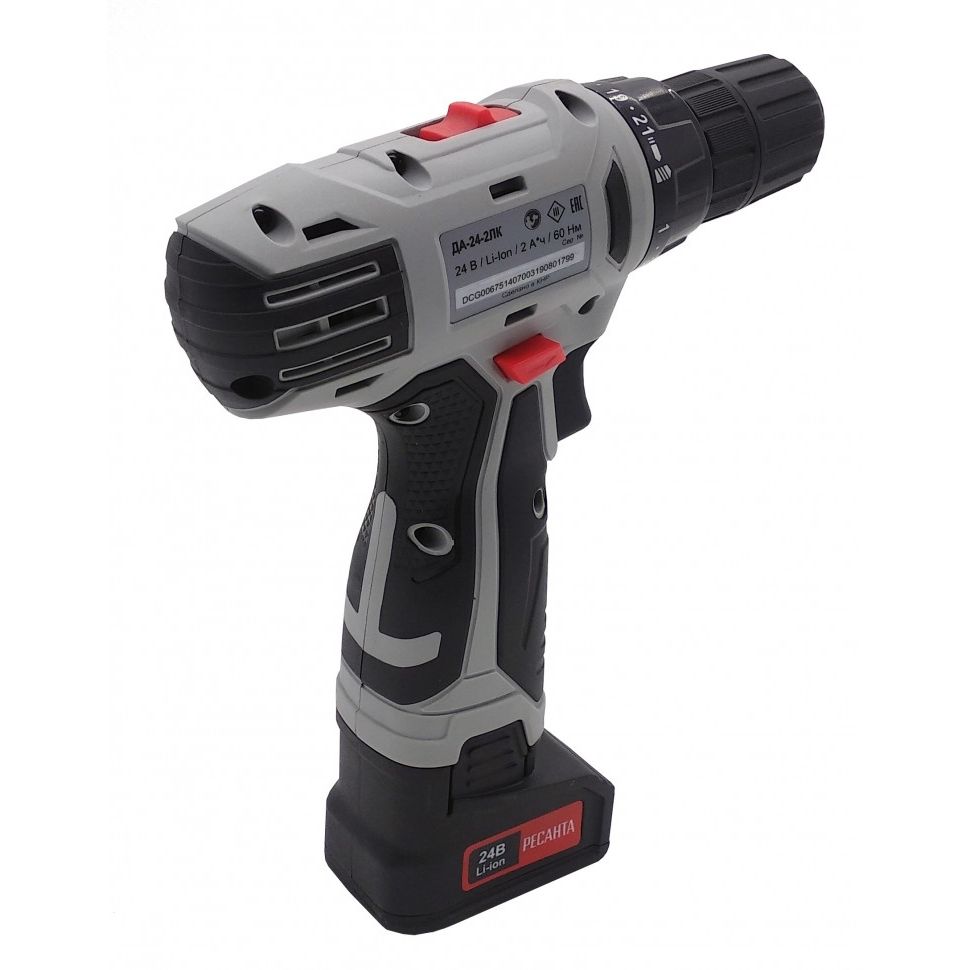 Дрель-шуруповерт аккумуляторная ДА-24-2ЛК Ресанта – незаменимый помощник мастера в ремонте или строительстве. Электроинструмент является аналогом модели ДА-24Л-2, отличие: есть кейс и второй аккумулятор. Прибор аккуратно сверлит отверстия на поверхностях из дерева и металла, а также накрепко закручивает шурупы. В комплект к дрели-шуруповерту поставляется удобный кейс, в котором можно хранить инструмент, зарядку к нему и другие рабочие детали. Не требует подключения к сети, что позволяет использовать ее в помещениях, где нет доступа к системе электропитания. Рабочие элементы легко заменить благодаря быстрозажимному патрону. Для ослабления креплений и выкручивания шурупов есть обратный ход. Форма рукоятки удобная, с резиновыми вставками, не скользит в руке. Система охлаждения мотора за счет вентиляционных отверстий на корпусе. Щёточный двигатель, две скорости (0-400 об/мин и 0-1400 об/мин). Модель работает от надёжного литий-ионного аккумулятора (Li-Ion).Преимущества:
