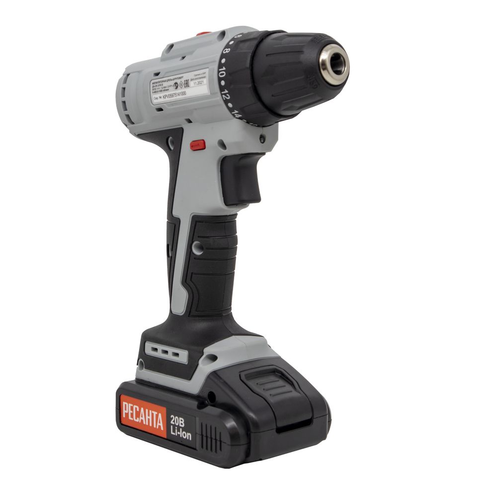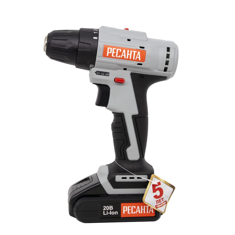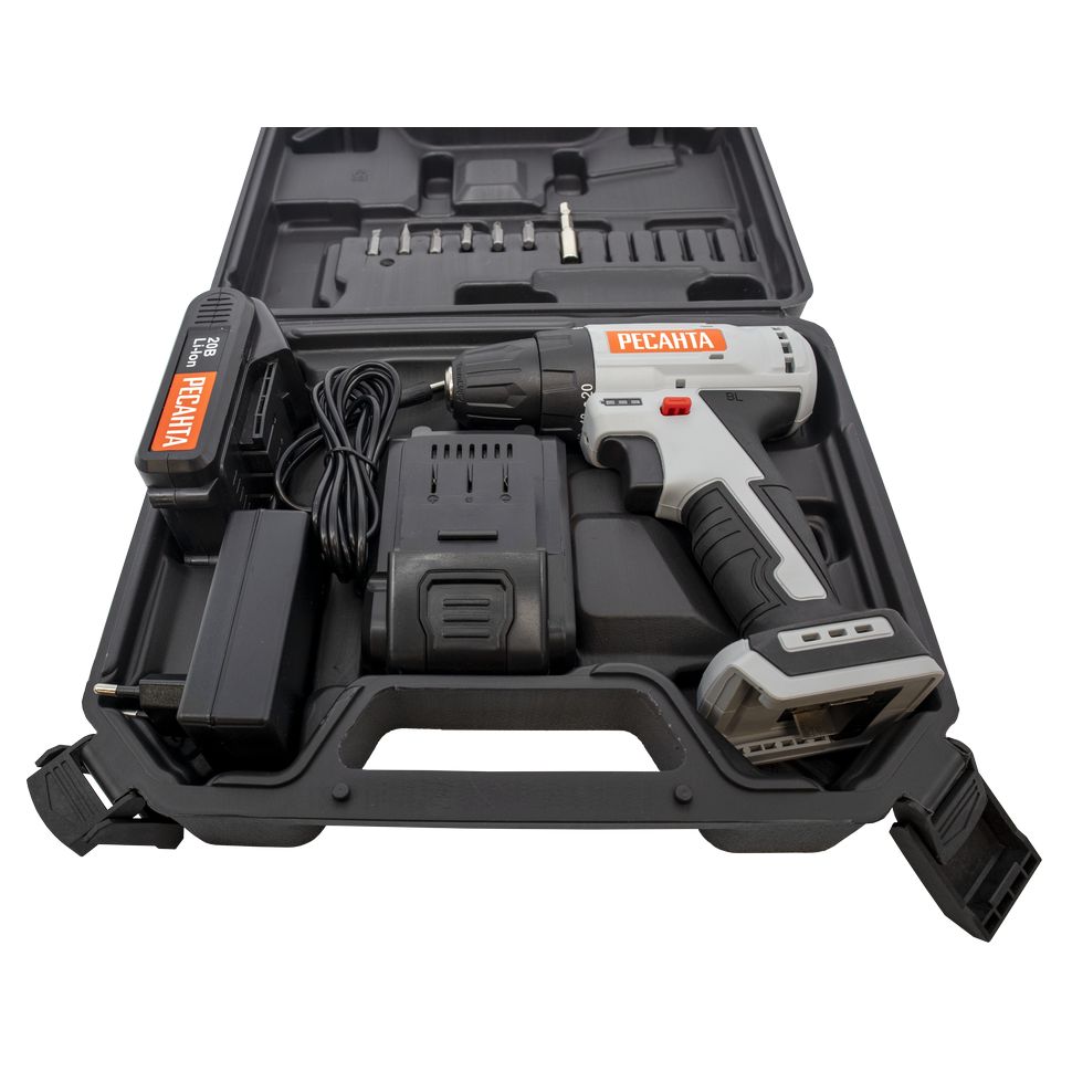 Дрель-шуруповерт аккумуляторная ДА-20-2ЛК-Б (2,0 А/ч) (бесщеточный двигатель) Ресанта используется для просверливания отверстий в деревянных, пластмассовых и металлических изделиях или для работы в качестве шуруповерта. Модель оснащена 2 аккумуляторами и незаменима для людей, постоянно использующих дрели-шуруповерты в быту.Прорезиненная рукоять обеспечивает удобное и надёжное удержание инструмента в руке во время работы. Быстрозажимной патрон облегчает замену рабочей оснастки. Двухскоростной редуктор для удобства ведения различных работ. Реверсивный механизм предназначен для быстрого изъятия сверла из материала в случае застревания, выкручивания или ослабления крепежа. С помощью регулировки частоты вращения инструмент можно настроить под необходимую толщину материала. Модель работает от надёжного литий-ионного аккумулятора (Li-Ion).Преимущества :Высокий крутящий момент.Удлиненная форма устройства обеспечивает удобство при сверлении в труднодоступных местах, а также усиливает корпус позволяя закручивать крепеж с наименьшими трудозатратами;Лёгкий вес и прорезиненная ручка обеспечивает комфортную работу даже при длительном использовании шуруповерта;Возможность регулировки крутящего момента позволяет использовать шуруповерт для работы практически с любым материалом (дерево, металл, пластмасса);Быстрозажимной патрон позволяет легко и быстро менять биты или сверла.Наличие кейса позволяет хранить в безопасности шуруповерт, а также облегчает его транспортировкуСистема защиты аккумулятора от перегрузок/замыканий.Эффективная вентиляция двигателяТормоз двигателя — мгновенная остановка при опускании клавиши пускБлокировка шпинделя. Возможность «довернуть» винт шуруповертом, как рычагом или затянуть патрон одной рукойКроме того, литий-ионные аккумуляторы имеют ряд преимуществ:не имеют «эффекта памяти», а значит могут заряжаться из любого состояния;обладают минимальной способностью саморазрядки;имеют значительную ёмкость;обладают троекратным превосходством перед никель-кадмиевыми источниками питания по количеству циклов зарядки-разрядки;имеют небольшие размеры, что объясняется конструкцией источника питания, состоящего из нескольких миниатюрных элементов.