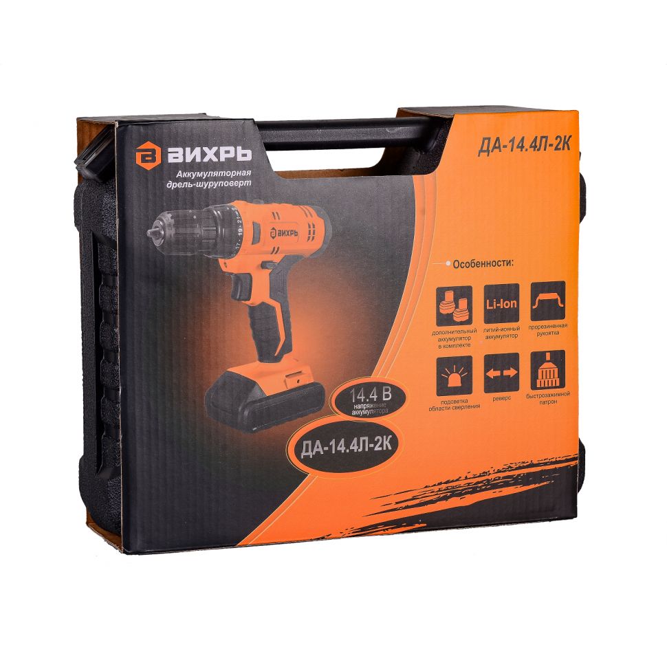 Дрель-шуруповерт ВИХРЬ ДА-14,4Л-2К используется для сверления отверстий в деревянных, пластмассовых и металлических изделиях или для работы в качестве шуруповерт. Модель оснащена 2 аккумуляторами и кейсом, незаменима для людей, постоянно использующих дрели-шуруповерты в быту.Электроинструмент является аналогом модели ДА-14,4Л-2, отличие: есть кейс и второй аккумулятор. Прорезиненная рукоятка обеспечивает удобное и надёжное удержание инструмента в руке во время работы. Быстрозажимной патрон облегчает замену рабочей оснастки. Двухскоростной редуктор для удобства ведения различных работ. Реверсивный механизм предназначен для быстрого изъятия сверла из материала в случае застревания, выкручивания или ослабления крепежа. С помощью регулировки частоты вращения инструмент можно настроить под необходимую толщину материала. Модель работает от надёжного литий-ионного аккумулятора (Li-Ion).Преимущества: