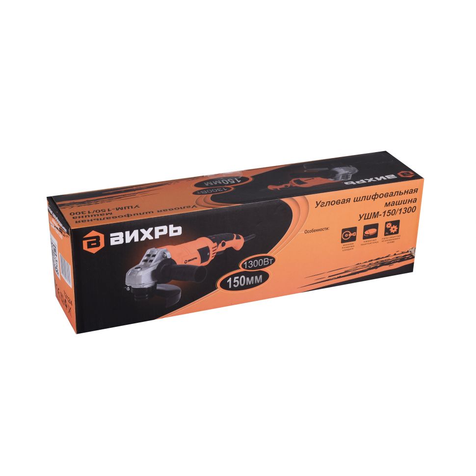 Углошлифовальная машина (болгарка) ВИХРЬ УШМ-150/1300 используется для зачистки, шлифования поверхности, резки материала.Комплект поставки: Угловая шлифовальная машина 1шт. Боковая рукоятка 1 шт. Защитный кожух 1 шт. Ключ фланцевый 1 шт.Паспорт (инструкция) 1 шт. Упаковка 1 шт.