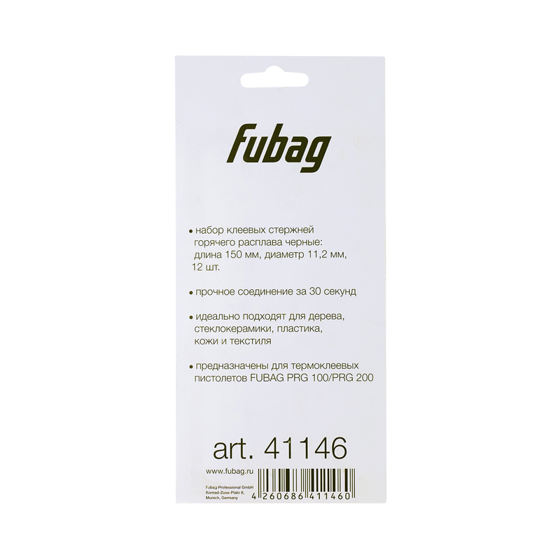 Клеевые стержни диаметром 11 мм для клеевых пистолетов FUBAG и моделей других производителей. Подходят для работы с деревом, стеклокерамикой, пластиком, кожей и текстилем. Обеспечивают прочное соединение за 30 секунд.